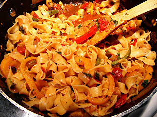 Prepare the noodles according to instructions on package; then, drain the noodles very well, and add them directly into the sauce, gently toss and combine the noodles with the sauce and all of the ingredients in it; check the seasoning to see if you need to add any additional salt or pepper.