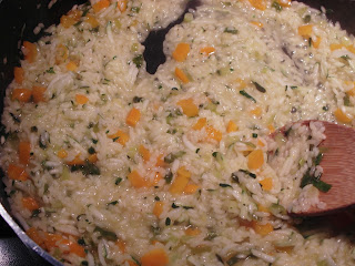 When there’s 1/3 of the broth remaining, add zucchini and peppers, season with more salt and pepper, then continue stirring.