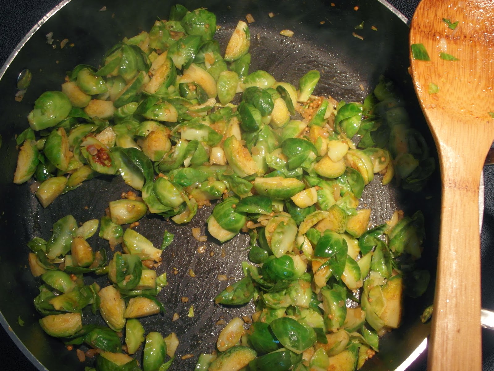 Toss sprouts with shallots and seasonings, there should be enough oil for them to glisten. If not, add more. Increase heat to medium high and cook for about 10 minutes until sprouts are sizzling, bright green and cooked through.