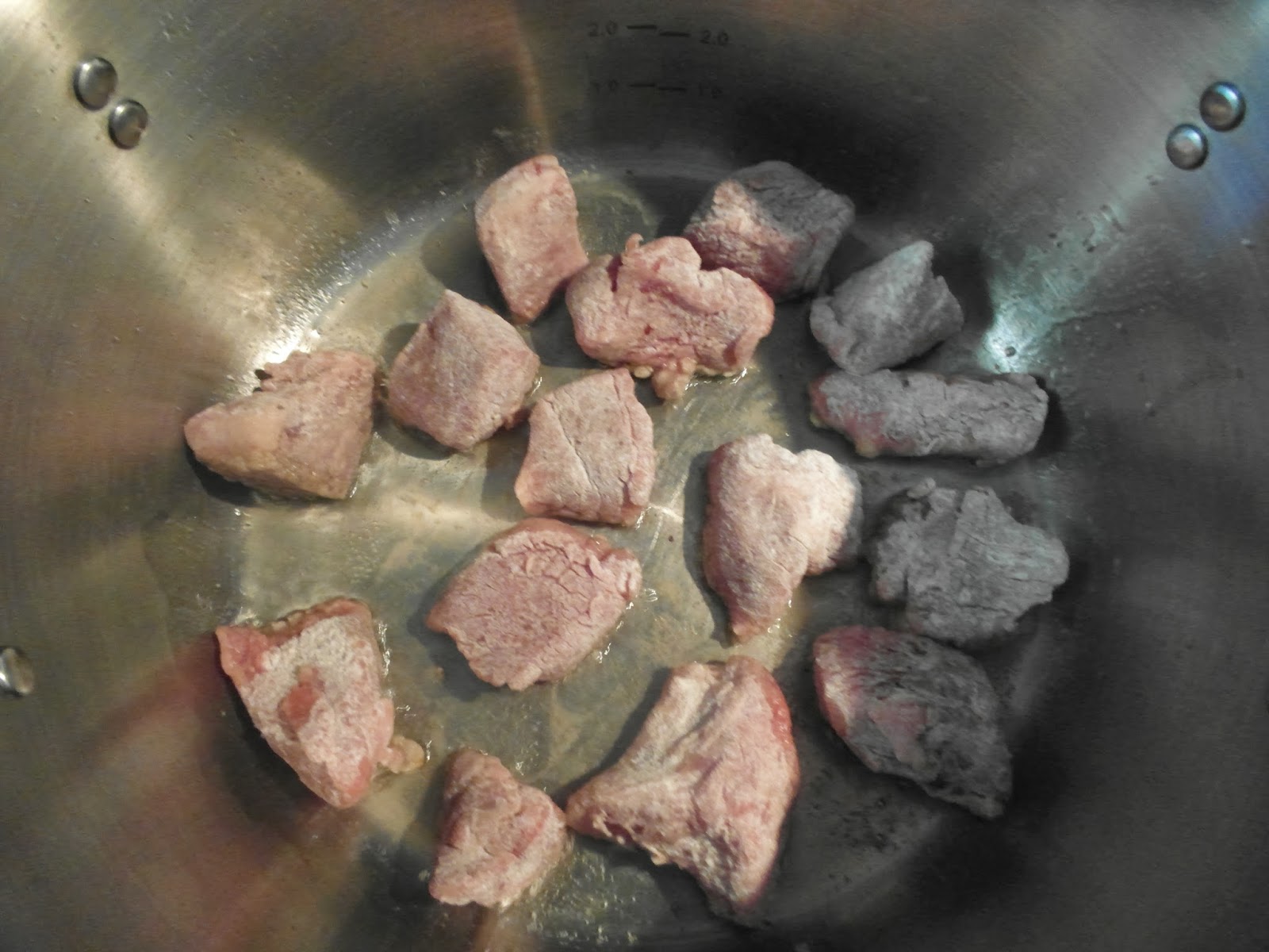 Add half the beef cubes to the pot and brown them on all sides – about 2 minutes per side. Remove them to a plate lined with a paper towel, and then repeat the browning process with the rest of the beef cubes.