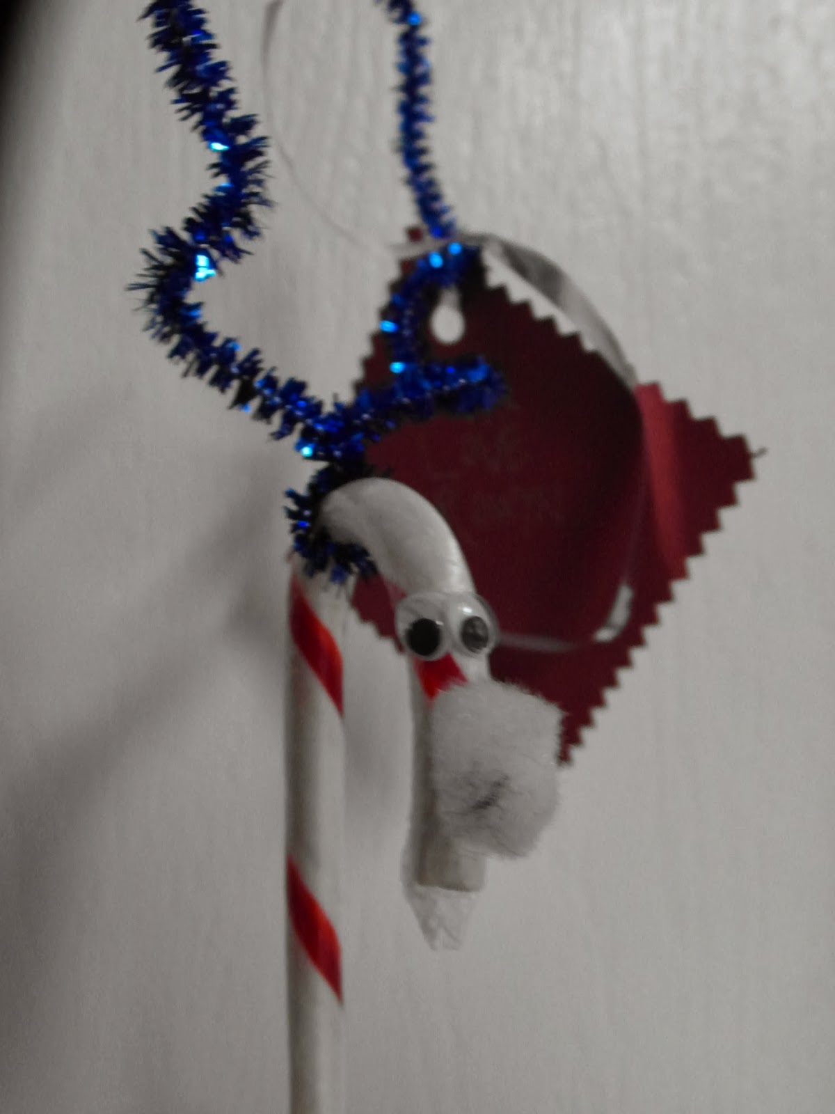 I twisted the pipecleaner on the candycane for antlers. Then HBear used a pencil and twisted the pipecleaner.