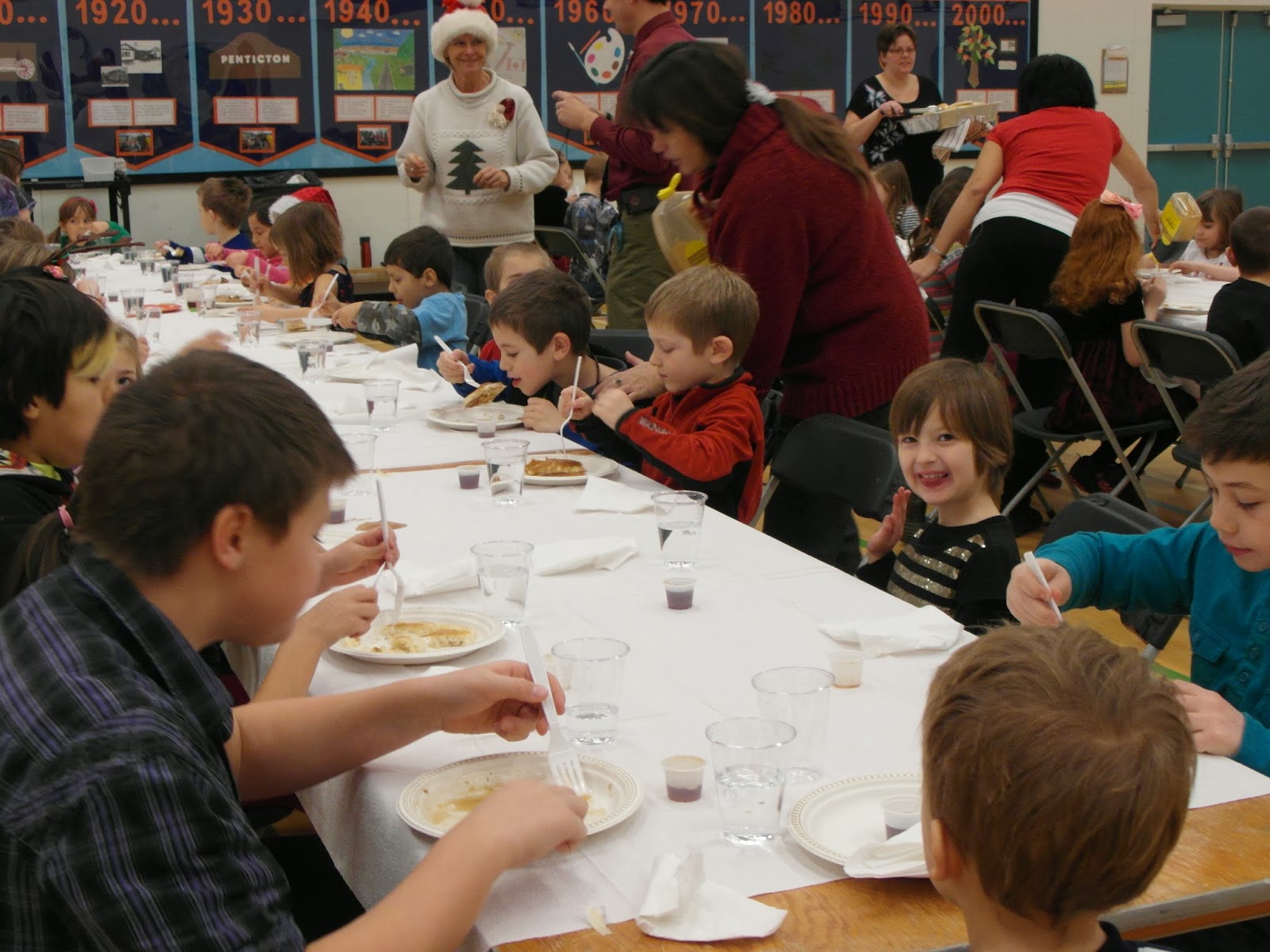 It was fun! The kids all came in 3 classes at a time and we turned the tables over very fast. Each child was given 2 pancakes, a glass of water and a little bowl of syrup. Then we went around topping up waters, filling plates with more pancakes and refilling syrups. One boy ate 31 pancakes!!! They weren’t huge but seriously 31?!?! HBear ate 3 lol. After the kids we served the teachers. They got pancakes with a fruit compote, whip cream and juice.