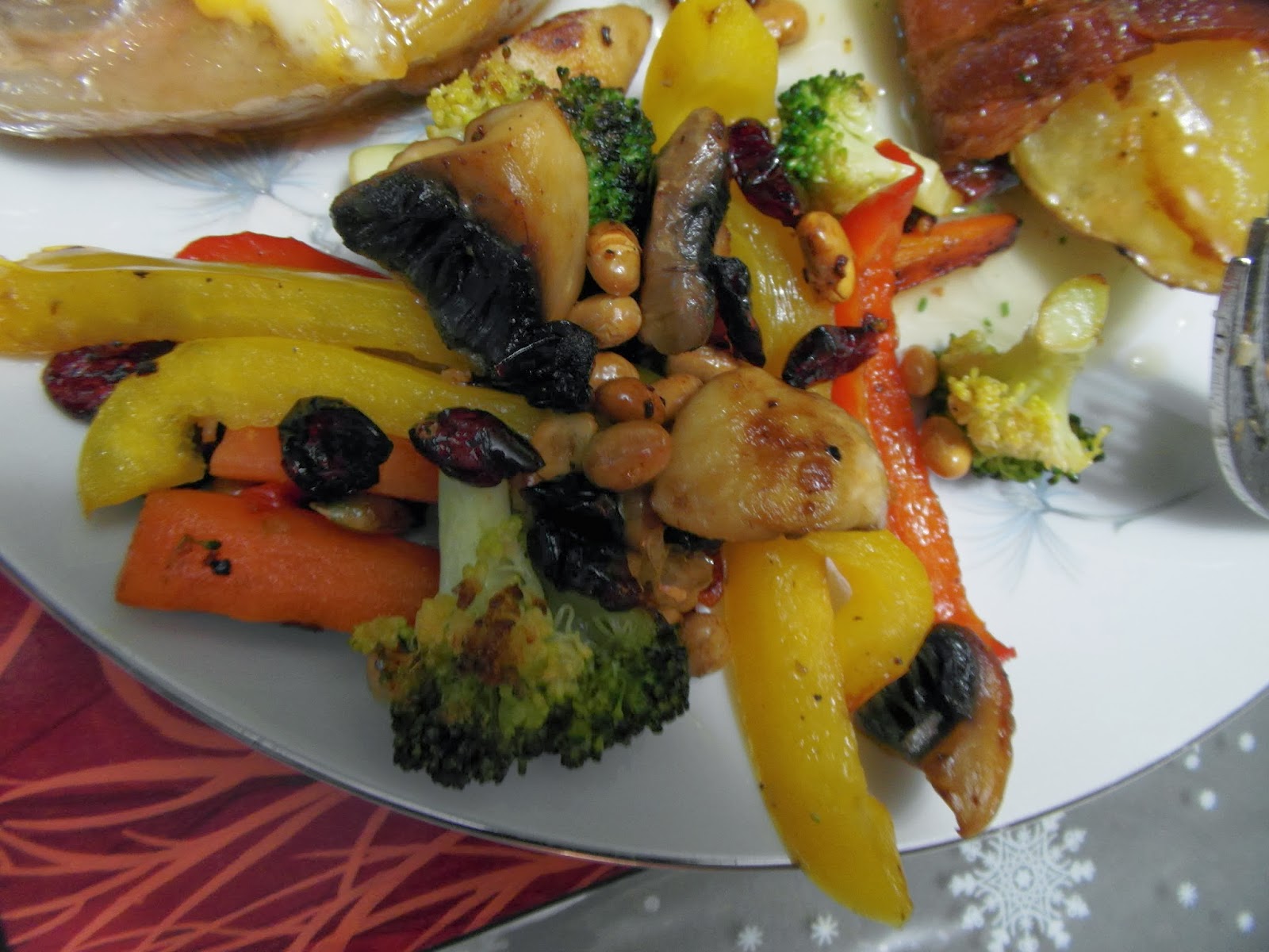 We had a little stirfry I tossed together too. When I make it I cut up whatever I have in the fridge and then add butter and garlic. When they are almost done I throw in a few Craisins and a few soy nuts, it adds a little sweet and a little crunch, YUMMY!