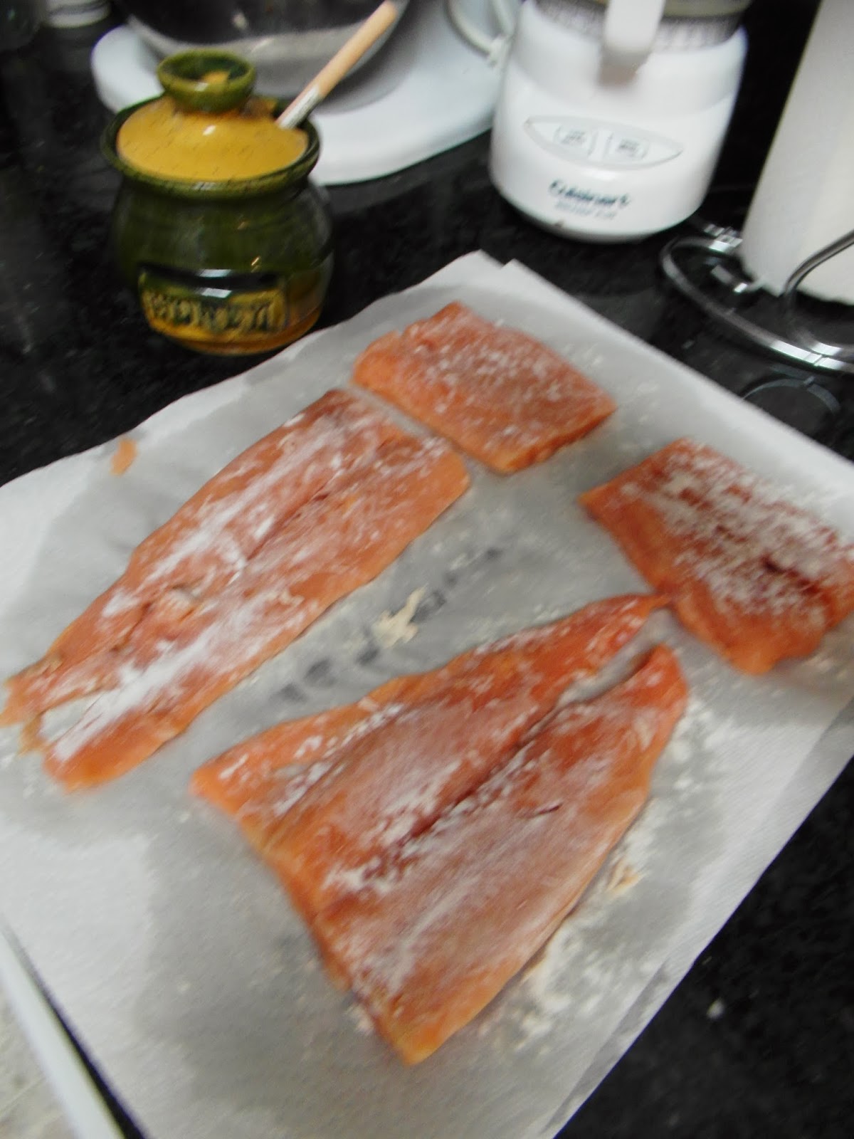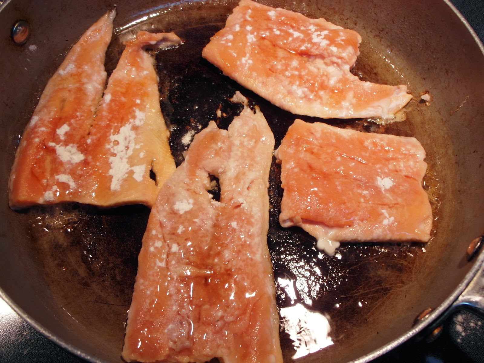 Salmon: Place salmon fillets on a cutting board or plate and sprinkle flour over each side of the salmon fillets and spread flour to evenly coat. Evenly drizzle honey over each side of the flour coated salmon fillets. (coat one side with the flour and honey then after adding it to the pan you can coat the other side)