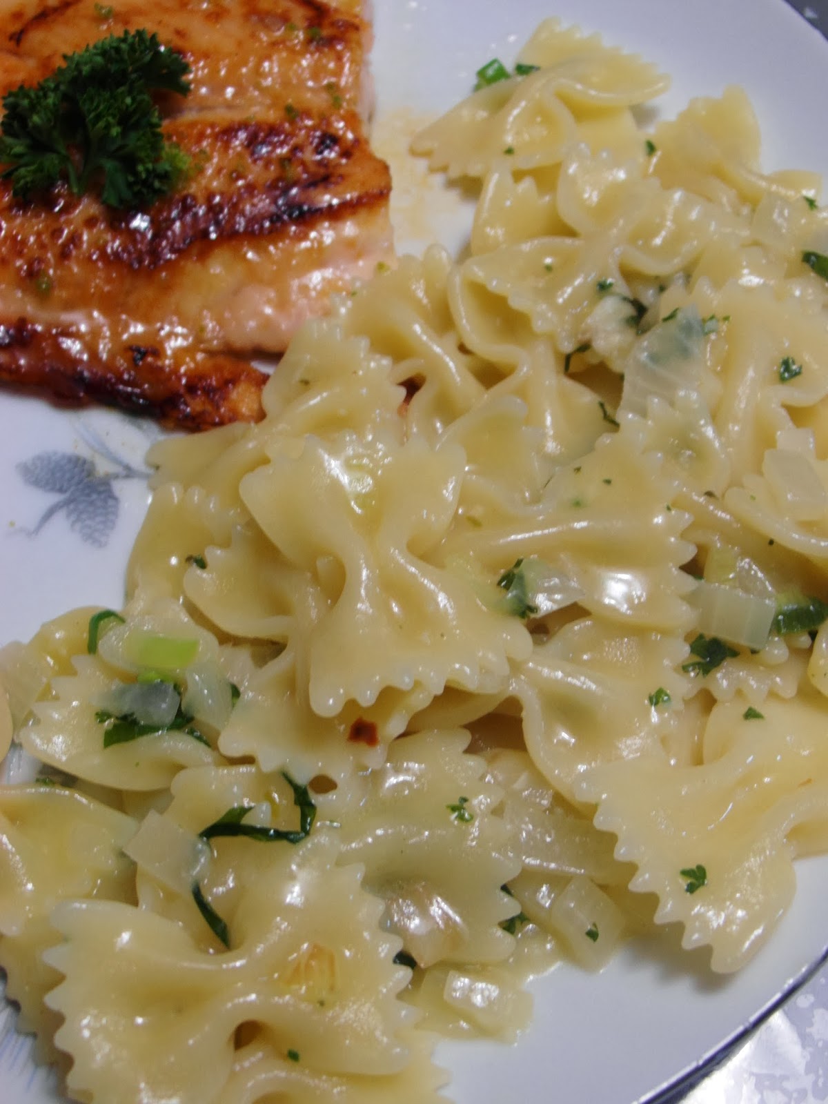 Sweet Chili Coleslaw, Honey Glazed Salmon and Parmesan and Garlic Farfalle