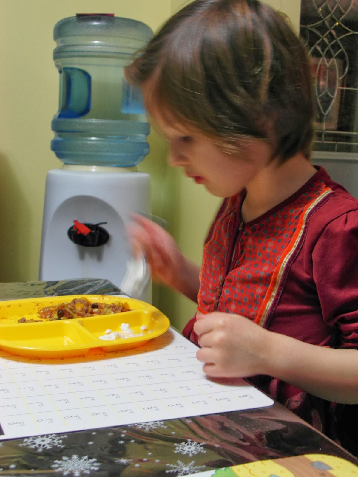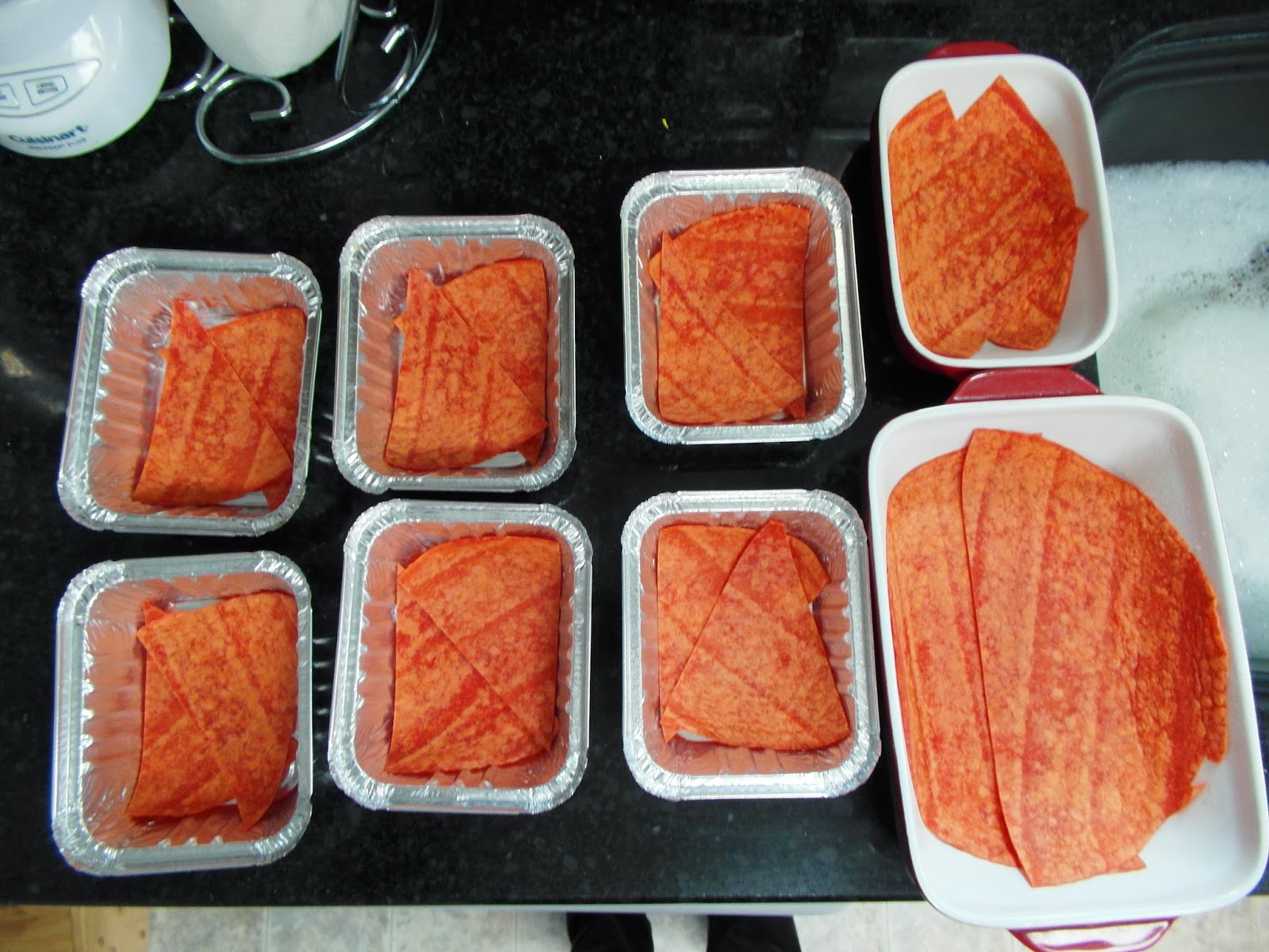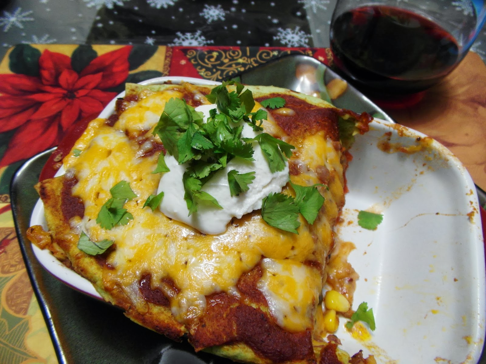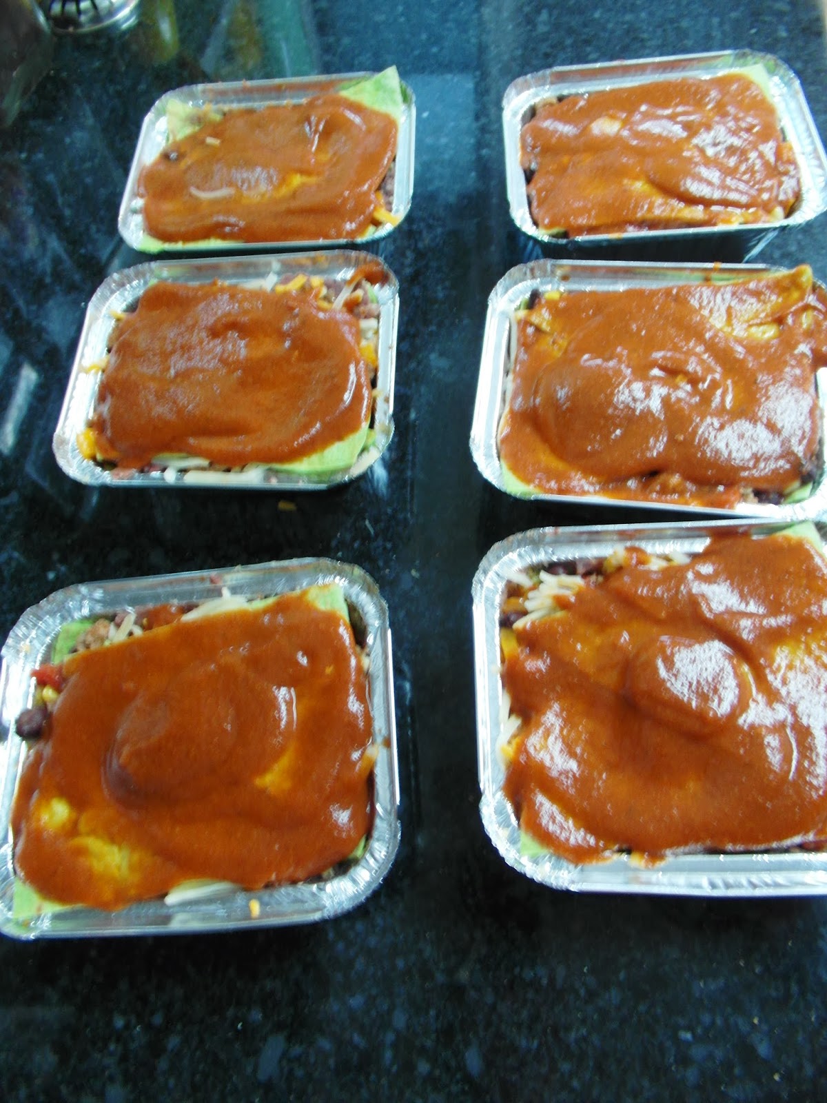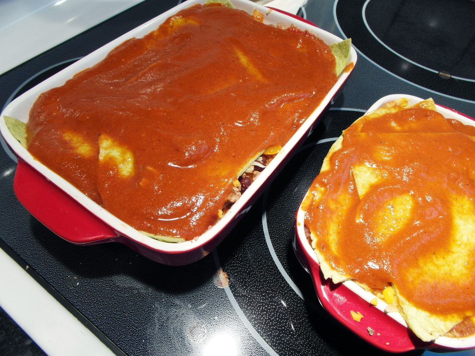 I try not to use canned products as much as I can. So I also used corn that I froze earlier in the fall and dry black beans. I also have 20 lbs of tomatoes in the freezer that I ALWAYS forget to use!!! The point is that you can use a can of enchilada sauce, a can of refried beans and a packet of taco seasoning J I know it seems crazy to make it all but it only took lunch. I mean, as I fed SBean I also made the sauce, the seasoning and the beans. By the time lunch was over I was at the same spot as if I had bought the items J. It only seems scary lol but you can do it!