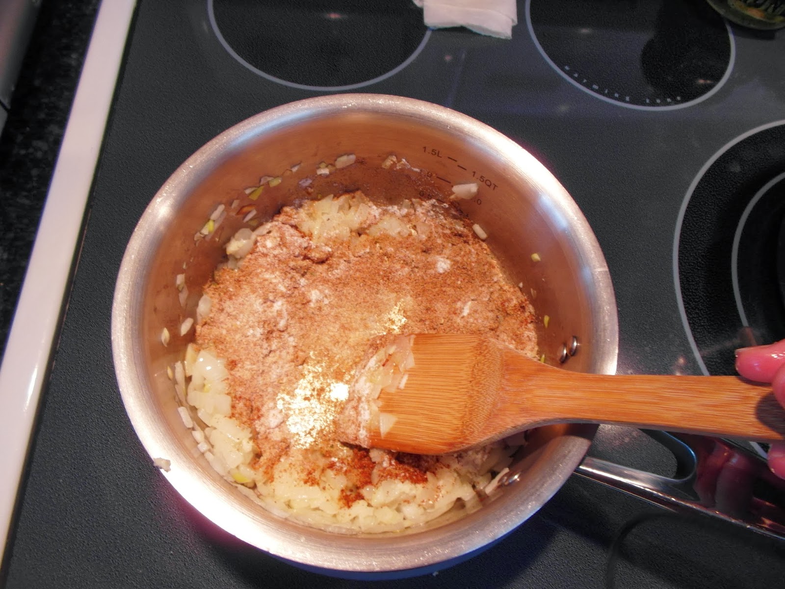 Heat oil in a saucepan over medium-high heat. Add diced onion and cook until just browned, about 5 minutes. Stir in garlic, flour, chili powder, cumin, salt and Italian seasoning and cook for about 30 seconds, stirring constantly.