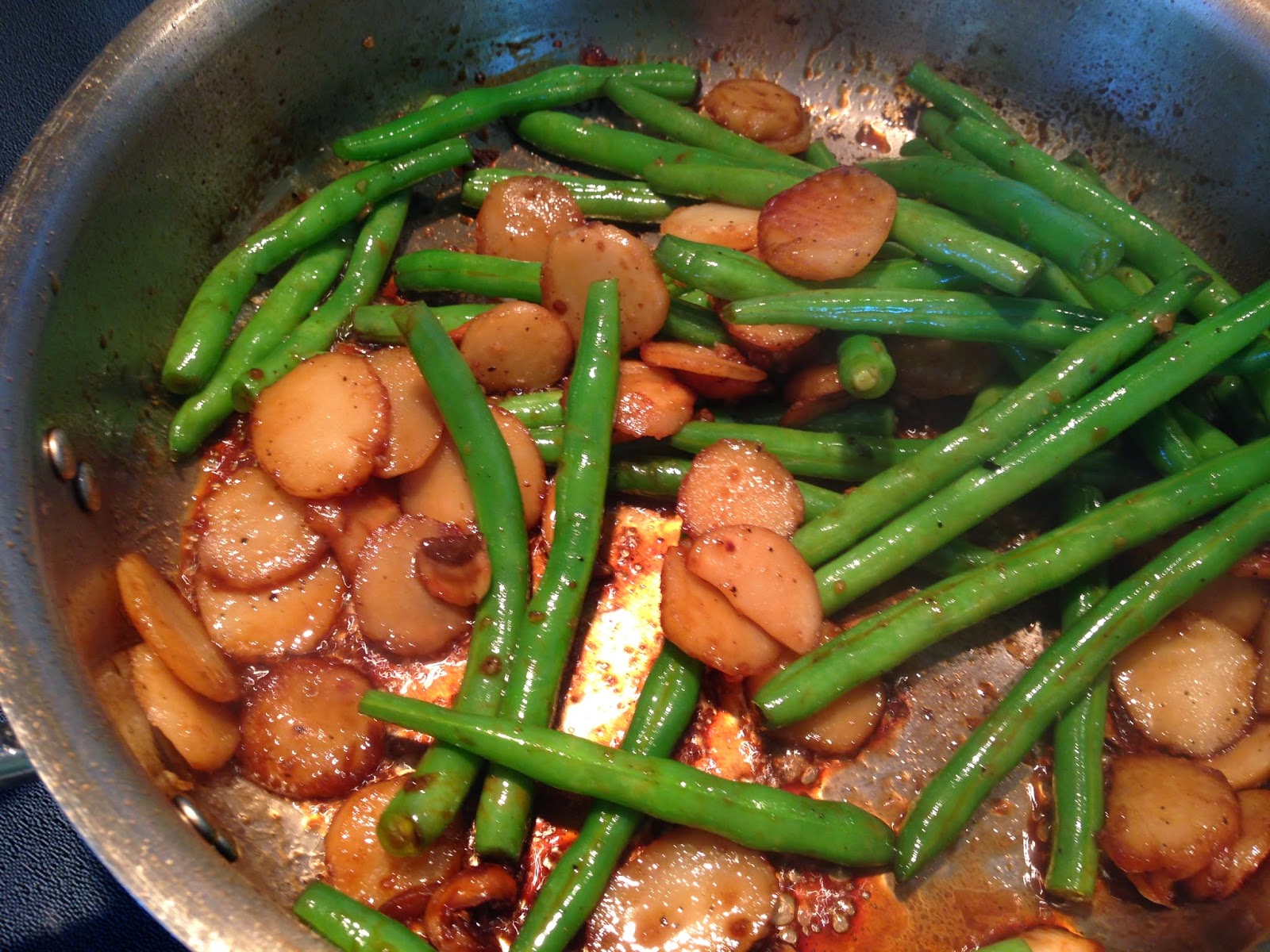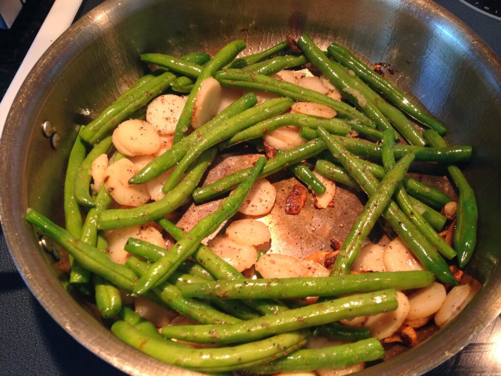 Add the garlic, green beans, and water chestnuts; season with salt and pepper.