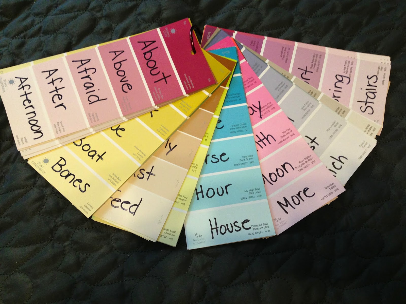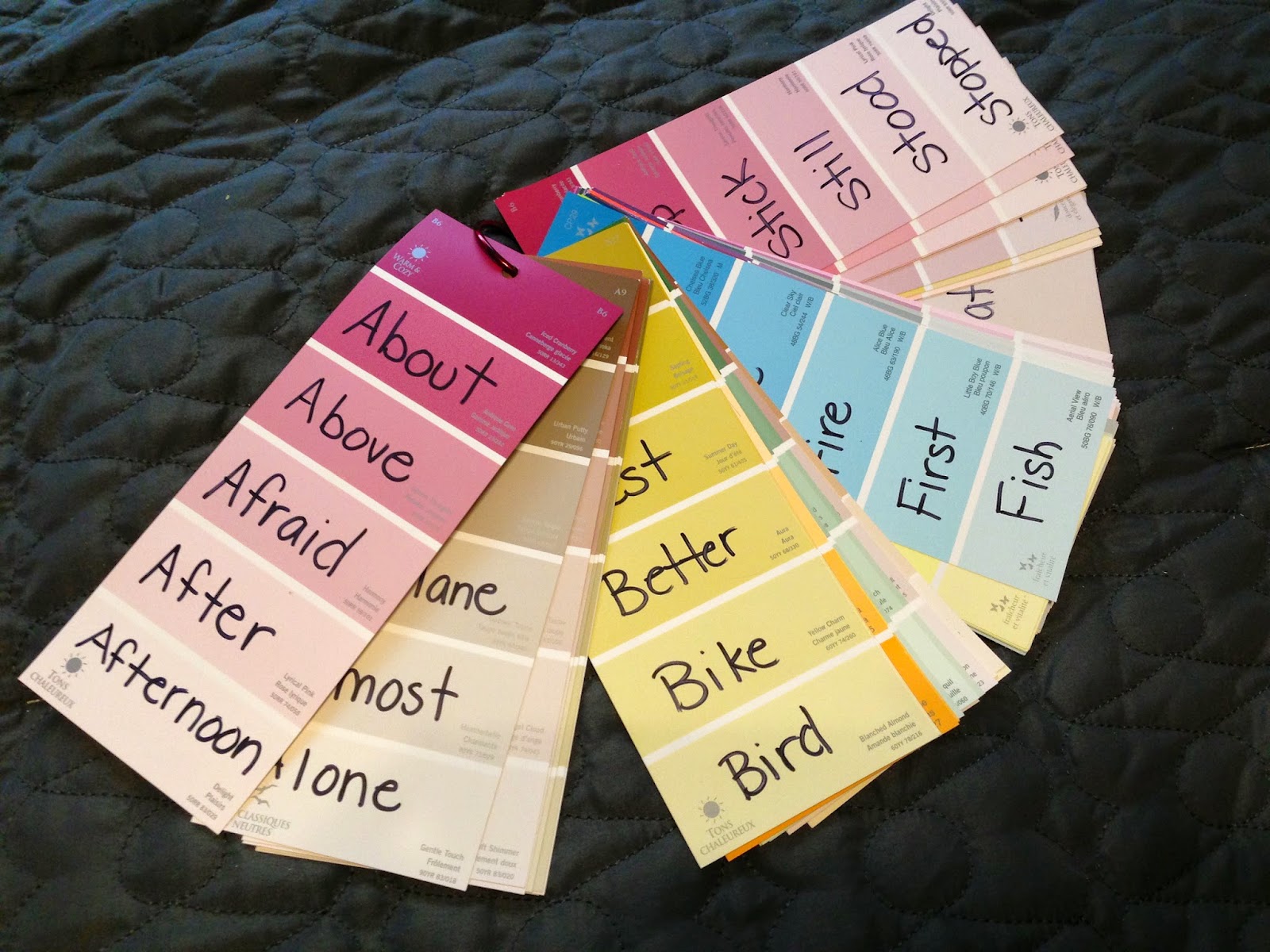 I have so many paint swatches from all this painting we have been doing 🙂 that I decided to use them to keep my sanity. With all that writing HBear is going to ask me,”Mommy how do you spell summer again? How do you spell mountain? How do you spell…” for at least 5 hours.