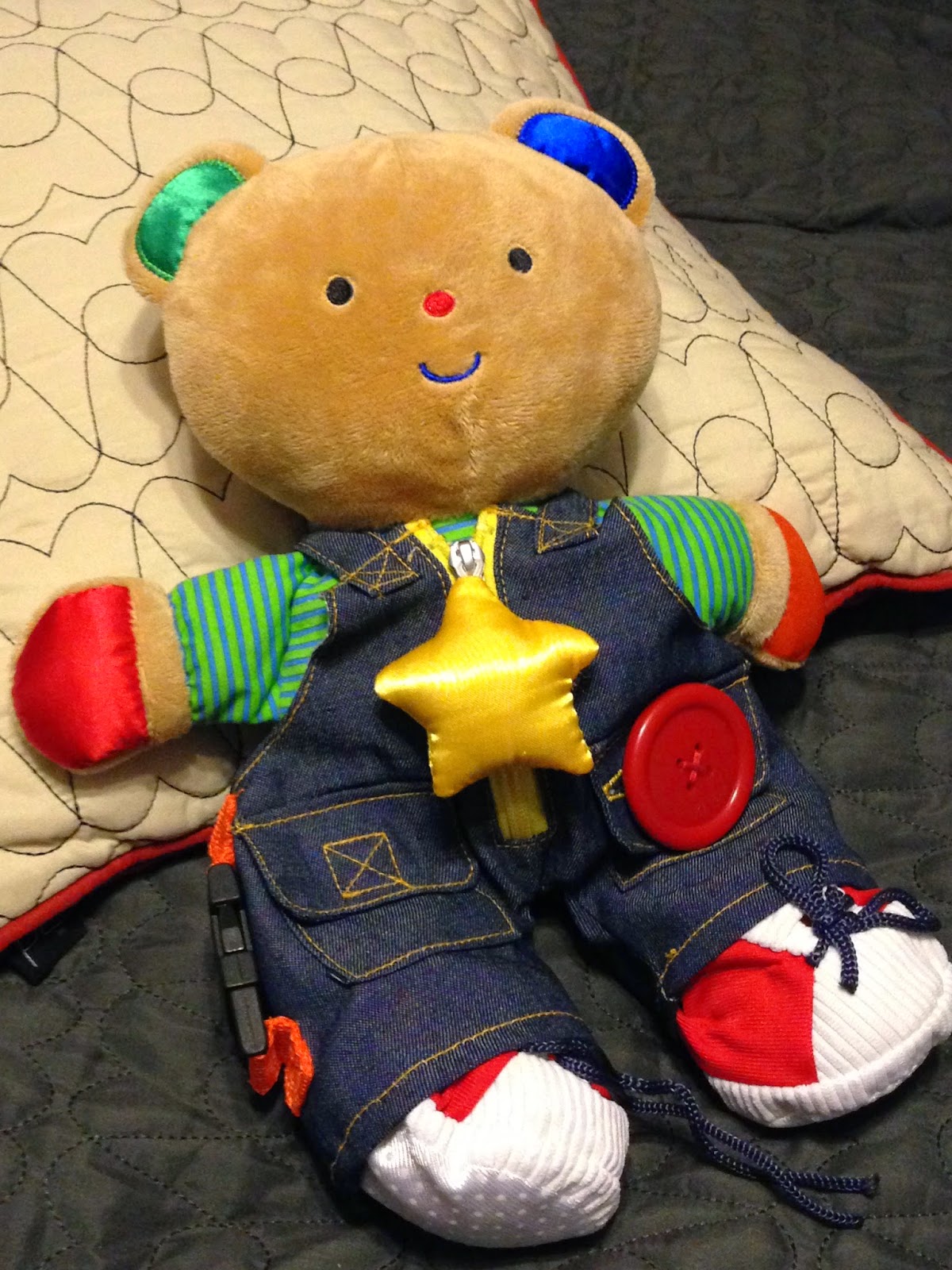 A Buttons Bear or something? I got it at the science store. SBean LOVES buckles and snaps and zippers, so I hoping for hours of entertainment out of it… BAHAHAHAHA!