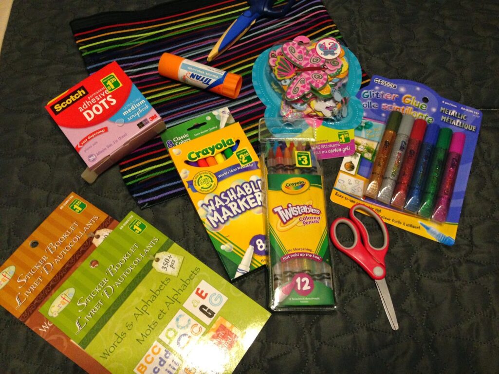 We got stickers, glitter glue, markers, pencil crayons, a sharpener, scissors, glue dots, and a glue stick.