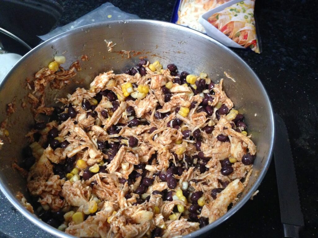 After chicken has been sitting 10 minutes, Add the beans and the corn to the chicken and mix it up.