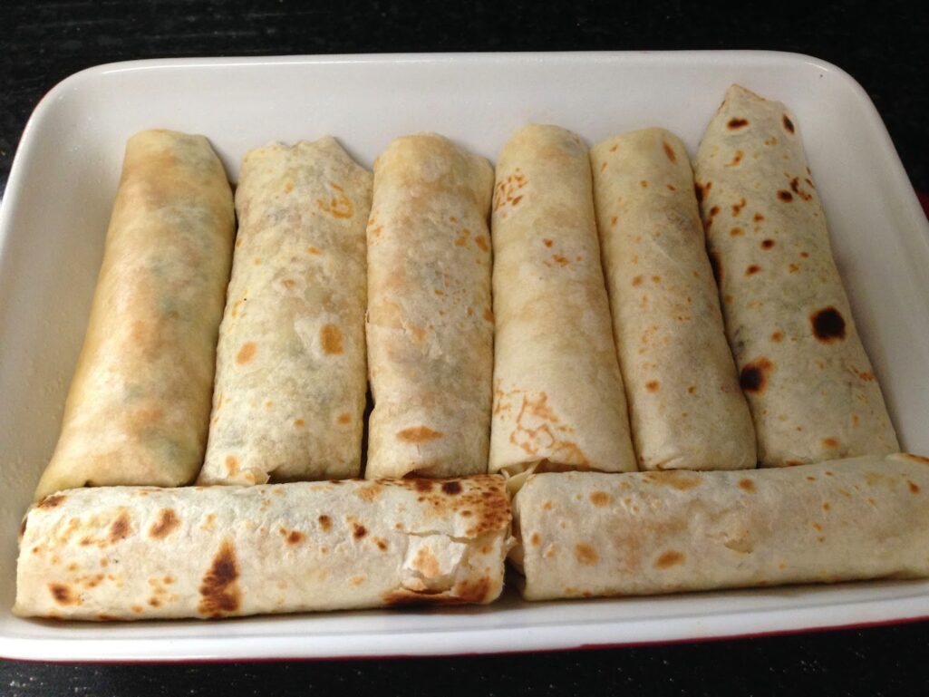 Begin assembling enchiladas by filling each tortilla evenly with chicken/bean/corn filling and 2 cups of cheese. Roll up each tortilla and place, seam side down, in the salsa verde coated baking dish.