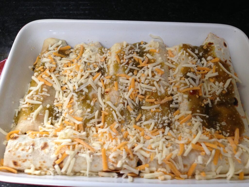 Pour the remaining salsa verde sauce over the enchiladas and cover with remaining 1/2 cup cheese.