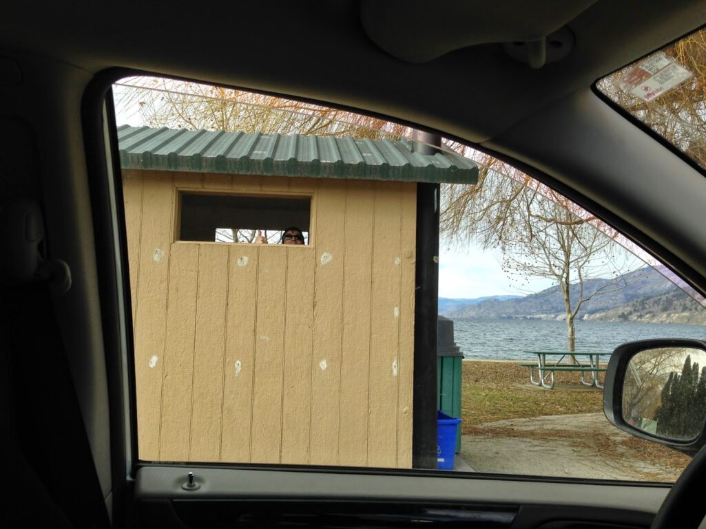 | Ninja stopped to pee at an outdoor potty. He waved to us through the opening LOL |