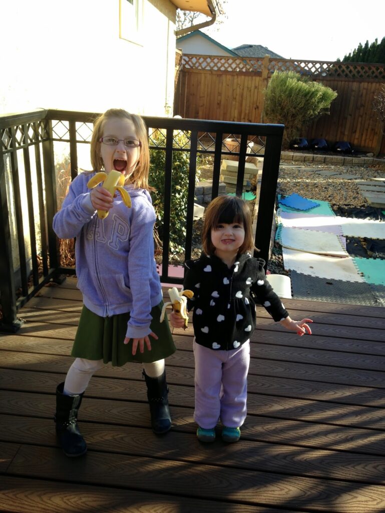 3:32 PM: “Mommy can we have a snack?” Shit! I realize that I did not fulfill my vow of making a healthy smoothie for the girls when we got home and now it’s too close to dinner. Take a look around grab some bananas… here you go girls.