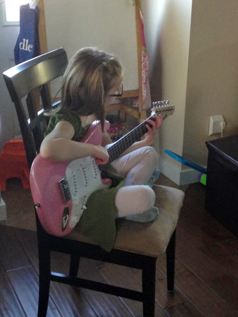 4:00 PM: It is time for guitar practice, the girls come inside. HBear practices and SBean warms up with some Mickey Mouse Clubhouse. I tidy up dishes, change over laundry and hang dry car seat. Fill up coffee, sugar and flour.
