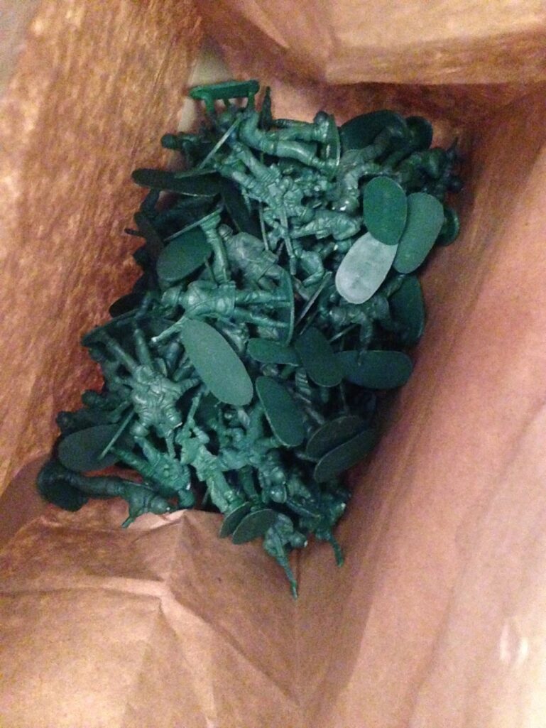 3:40 PM: HBear has to bring 100 of something to school on Wednesday for the 100th day of school. We count out 100 army guys, by 1’s, 2’s, 5’s and 10’s.