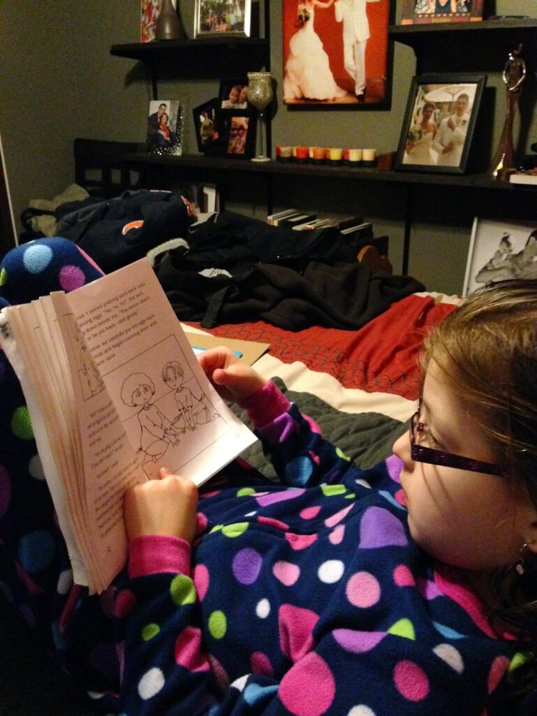 6:45 PM: Sit down with HBear to do home reading and work on her calendar. She is doing great keeping a fantastic record of all her milestones and fun activities.