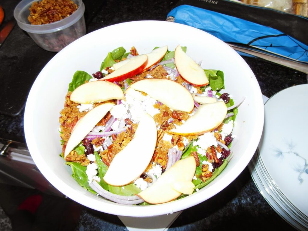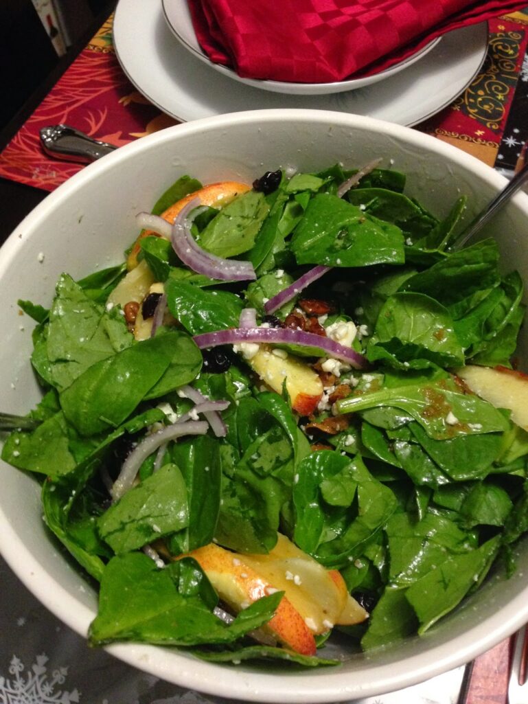 Spinach-Apple Salad With Maple-Cider Vinaigrette, Corn and Bacon Casserole, and Champagne Risotto