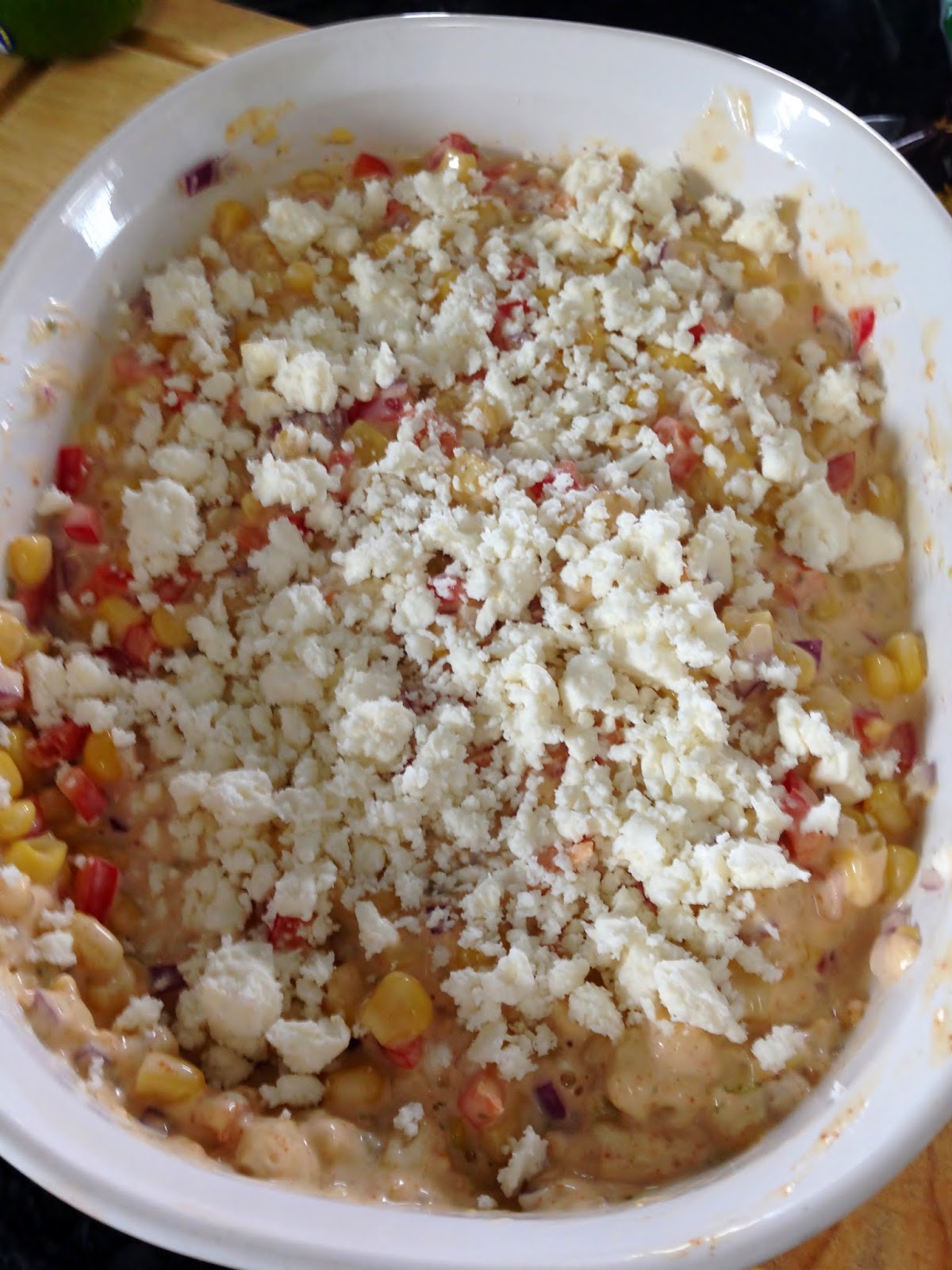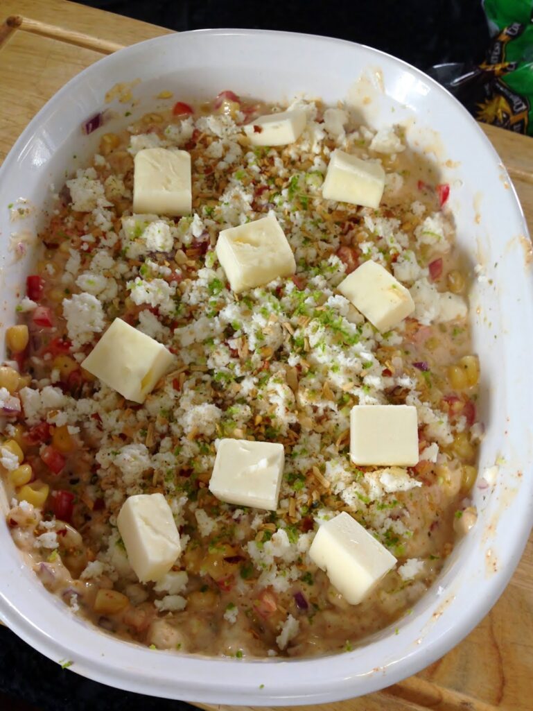 Pour into a baking dish, sprinkle the Feta cheese on the corn and place butter slices evenly across top. Sprinkle 1/2 teaspoon of Salsa seasoning.