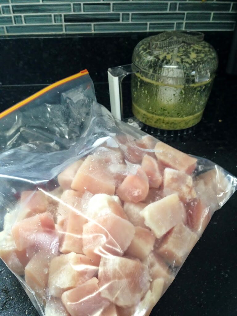 Place chicken cubes in a large resealable plastic bag. Pour in marinade and seal bag, removing as much air as possible. Place in refrigerator and marinate for at least 1 and up to 5 hours.