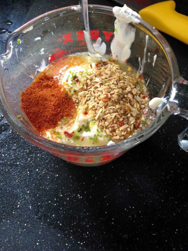 In a small bowl whisk together mayonnaise, lime zest, lime juice, seasoning blend, and paprika.