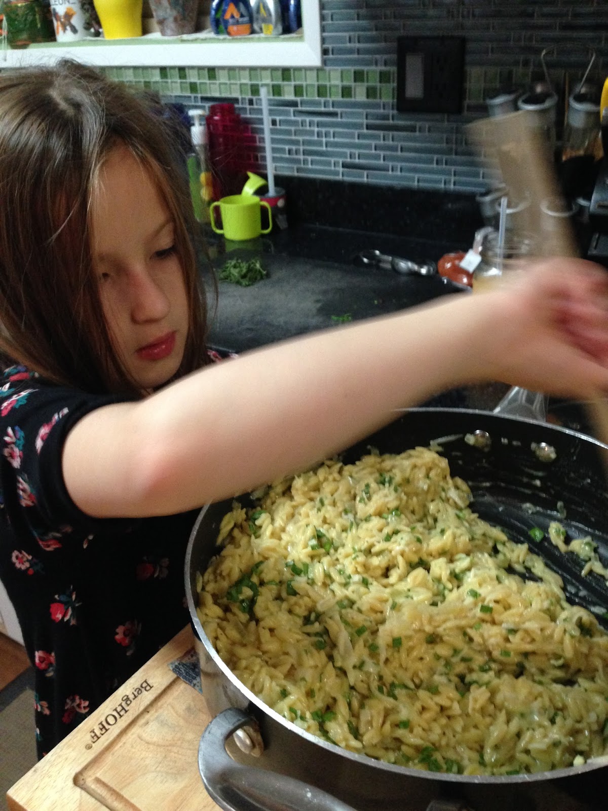 Add orzo to onion and garlic in skillet.
