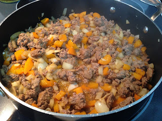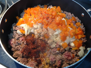 Add onion, peppers, garlic, ground pork, dry mustard, chili powder, salt and pepper. Sauté until ground pork is no longer pink, breaking up pork as you cook.