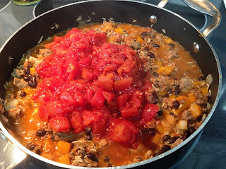 Add canned tomatoes with juice, water and Worcestershire sauce. Stir, cover and simmer for 20 minutes covered.
