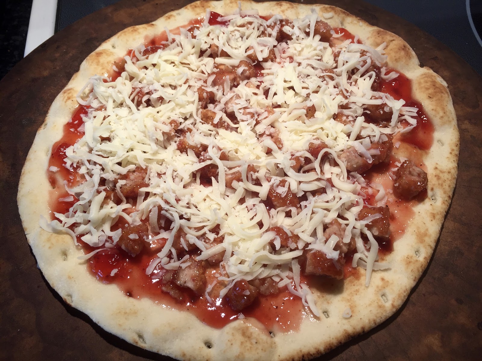 Pour rest of sauce onto pizza dough and spread to cover. Leave a 1 inch border all around the edge. Scatter chicken evenly over the sauce.