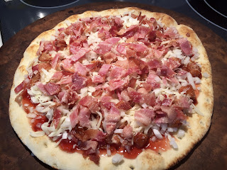 Place about ¾ of the cheese on top of dough and spread to cover sauce evenly. Scatter bacon and sweet onion over cheese to distribute evenly. Scatter remaining cheese over this layer.