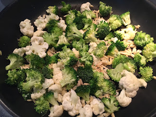 As the pasta is cooking, heat oil in a large saute pan over medium-high heat. Add the cauliflower, almonds and broccoli florets and season with a few pinches of salt and pepper. Saute, stirring once a minute or so, for 4-5 minutes until cooked through.