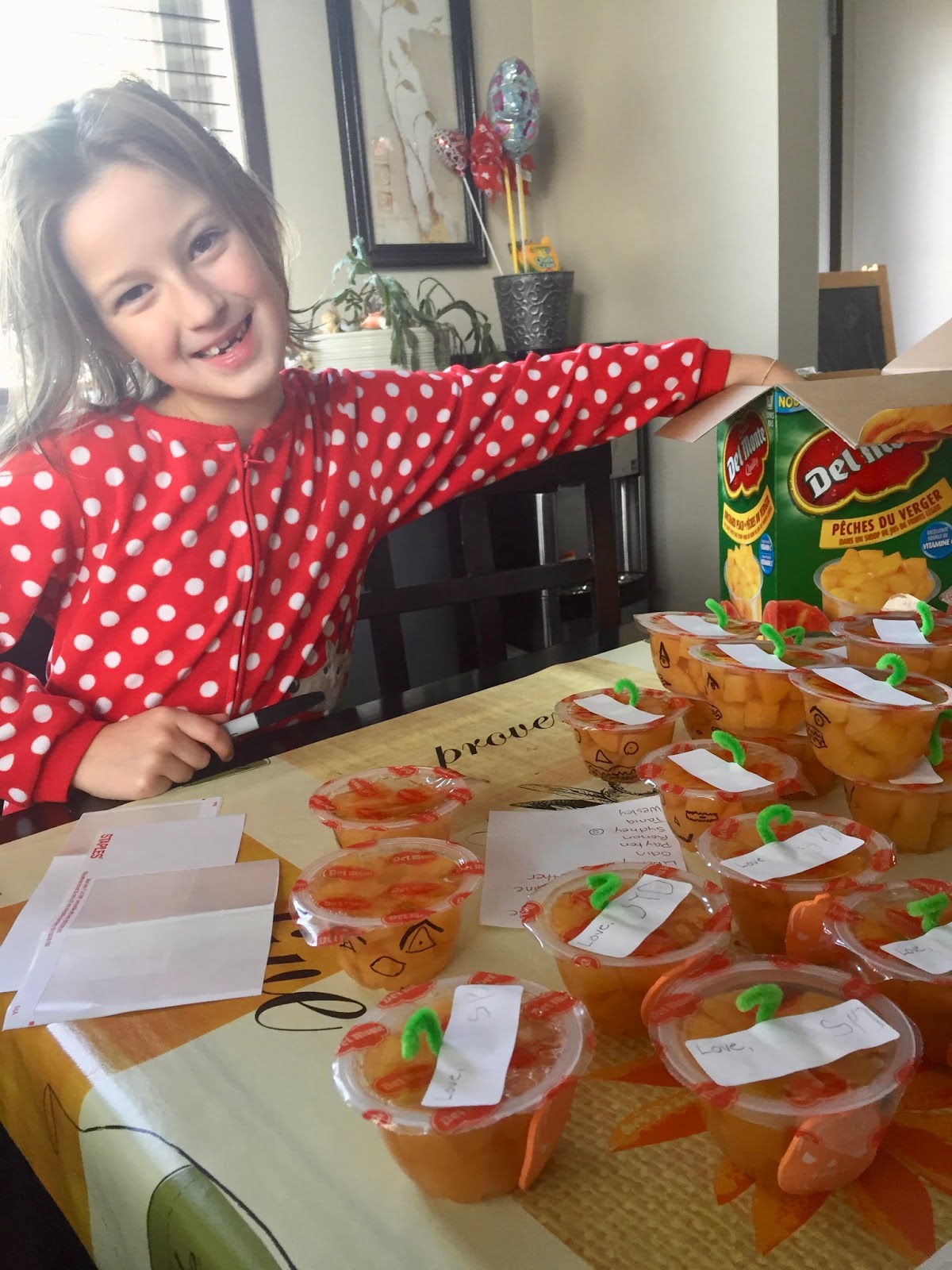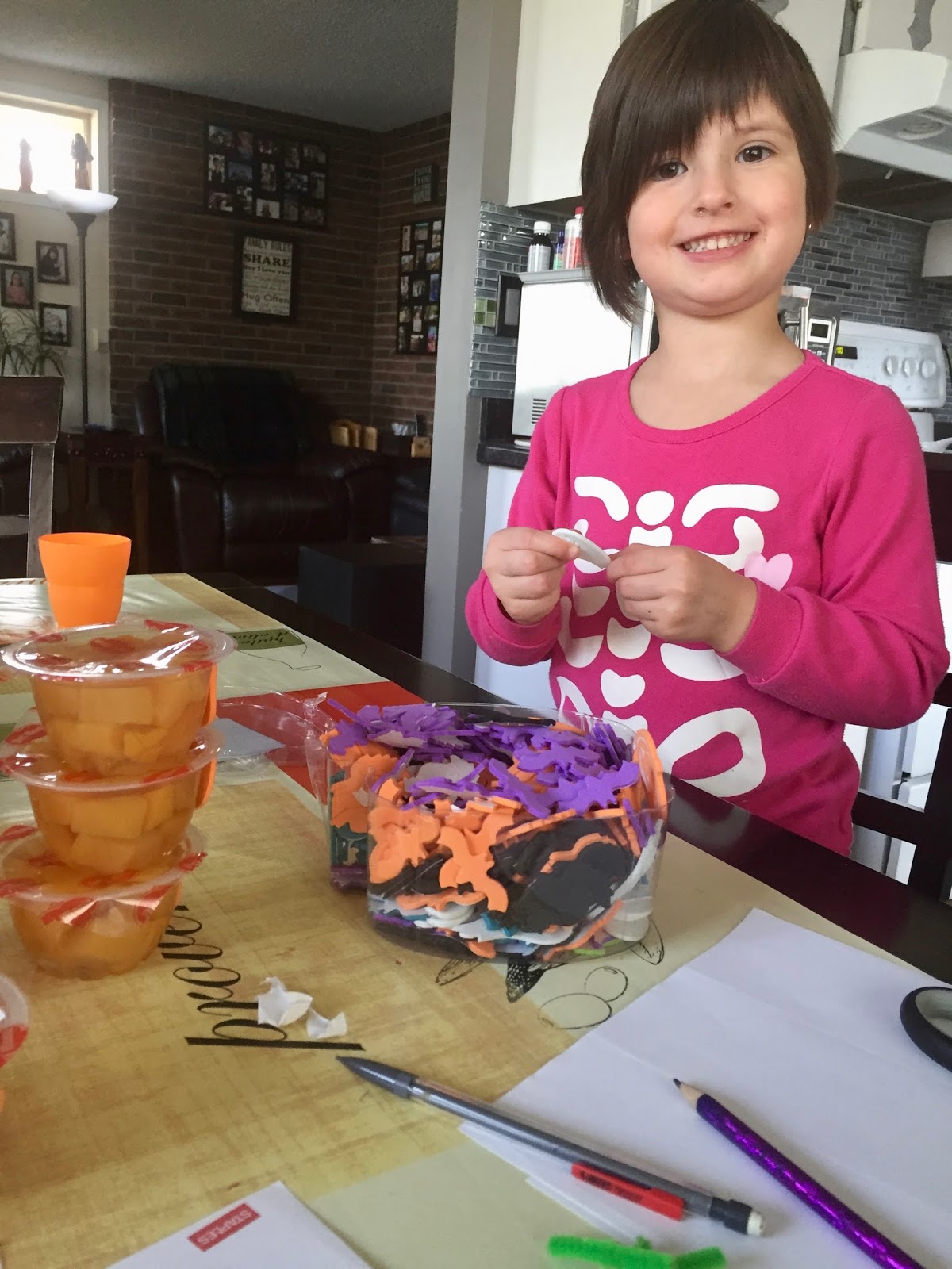 We also made our class Halloween treats! This year we made fruit cup Jack o’lanterns. OK I have to say something here… I asked HBear how many kids are in her class and she answered 23 but 1 boy is a Christian so he doesn’t celebrate Halloween.