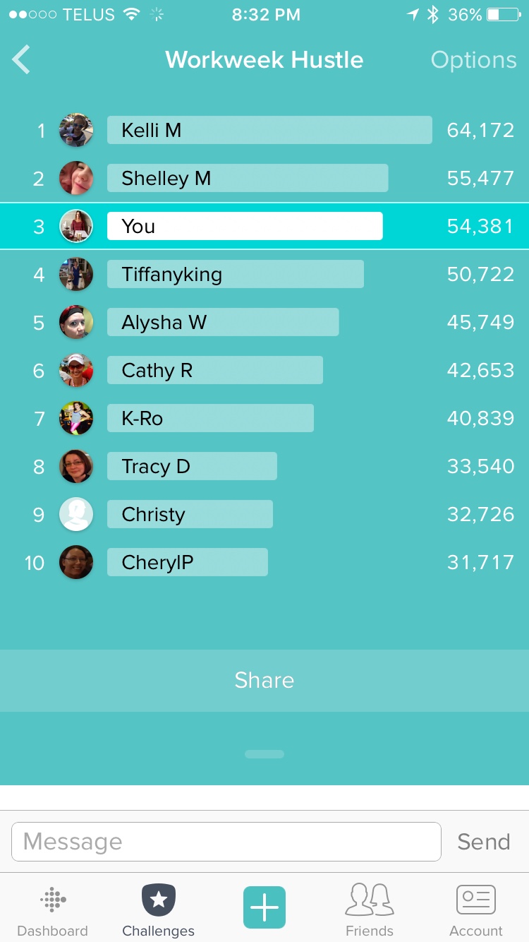 Which brings me to the new thing I’m doing! Challenges! What I love most about my Fitbit is that it keeps me accountable. I can’t lie to myself 😉 if I didn’t get my water goal that day… It’s because I didn’t drink enough water. When I look down and see that I have not made my step goal, I am disappointed in myself. If I didn’t meet my goal of exercise 5 out of 7 days, I know that I didn’t put enough effort into myself that week. To up the ante on accountability I have joined the Week Day Hustle Challenge with around 10 ladies in our community. I only know 1 or 2 of the ladies but these women are in it to win it! The first week I came in 6th. I even thought I had a pretty good week LOL but apparently not as good as 5 other women! Next week I came in 4th.