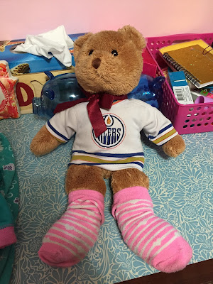 She does and says and HEARS the most interesting things. I remember last week when she got out of bed for the 14th time saying Ales was cold. I told her to deal with it and get back into bed! This week I was changing linens and I saw Ales Hemsky (my teddy bear lol) in HBear’s bed. Apparently she dealt with it. 😂