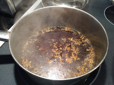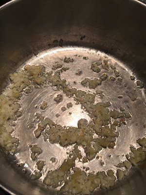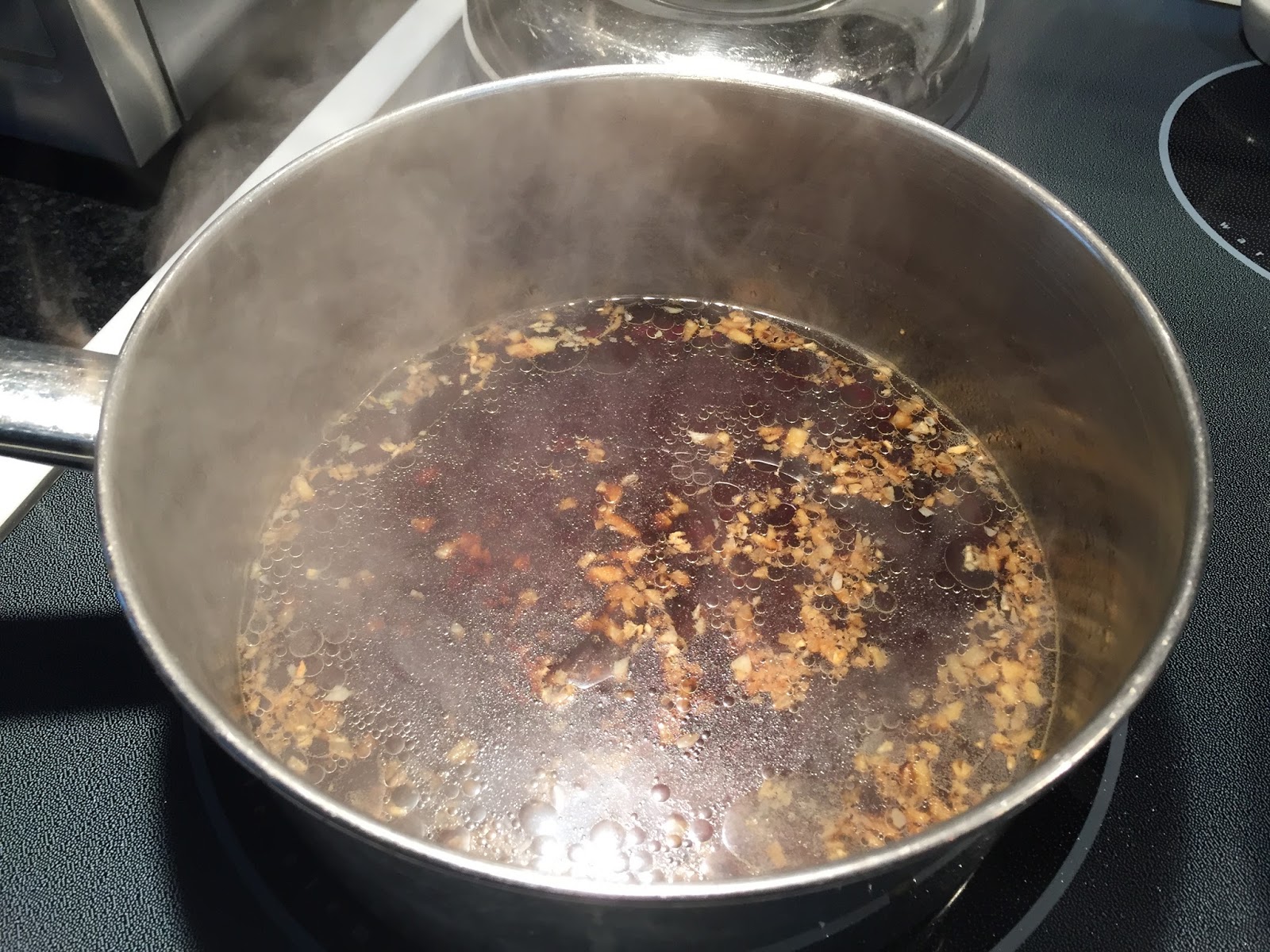 In a saucepan, heat 2 tablespoons of oil on high. Add in the ginger and garlic. Stir quickly for 10 seconds.