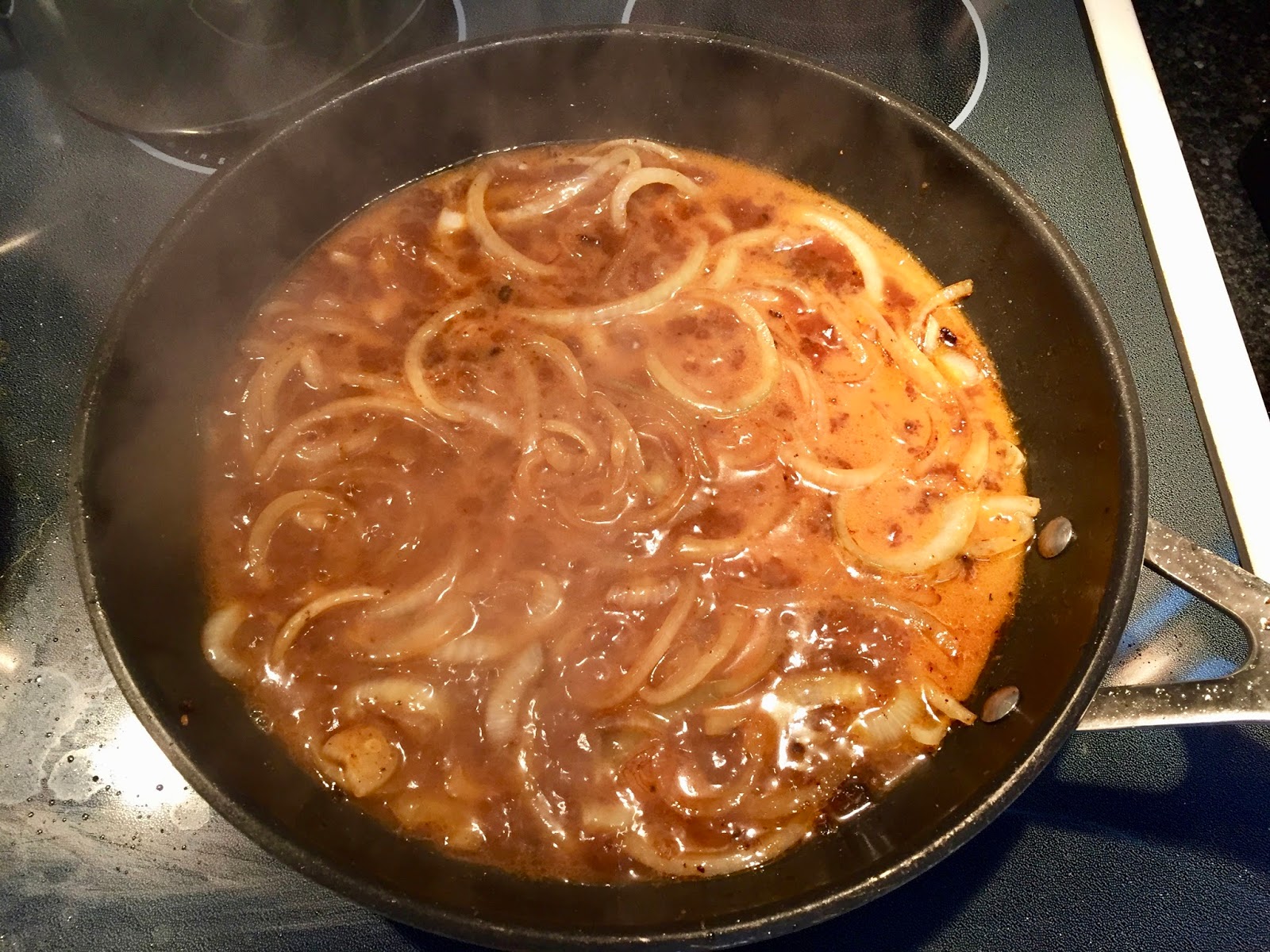 In a bowl add the cornstarch and beef broth and whisk. Add broth and remaining gravy ingredients to skillet, and cook for about 3 to 5 minutes, sauce should thicken. Thin with beef broth if needed and taste for seasoning.
