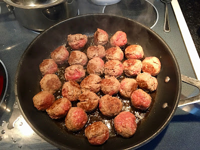 Add the oil to a large skillet and heat over medium high heat. Add meatballs and cook, you might have to fry them in a couple batches. Cook the meatballs on all sides, add more oil if needed. Remove meatballs from skillet and set aside.