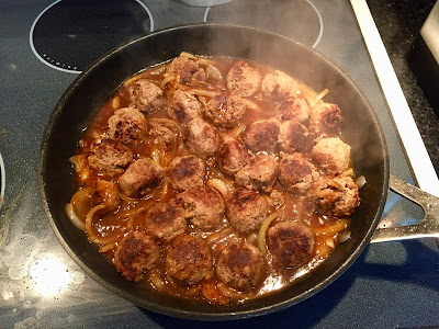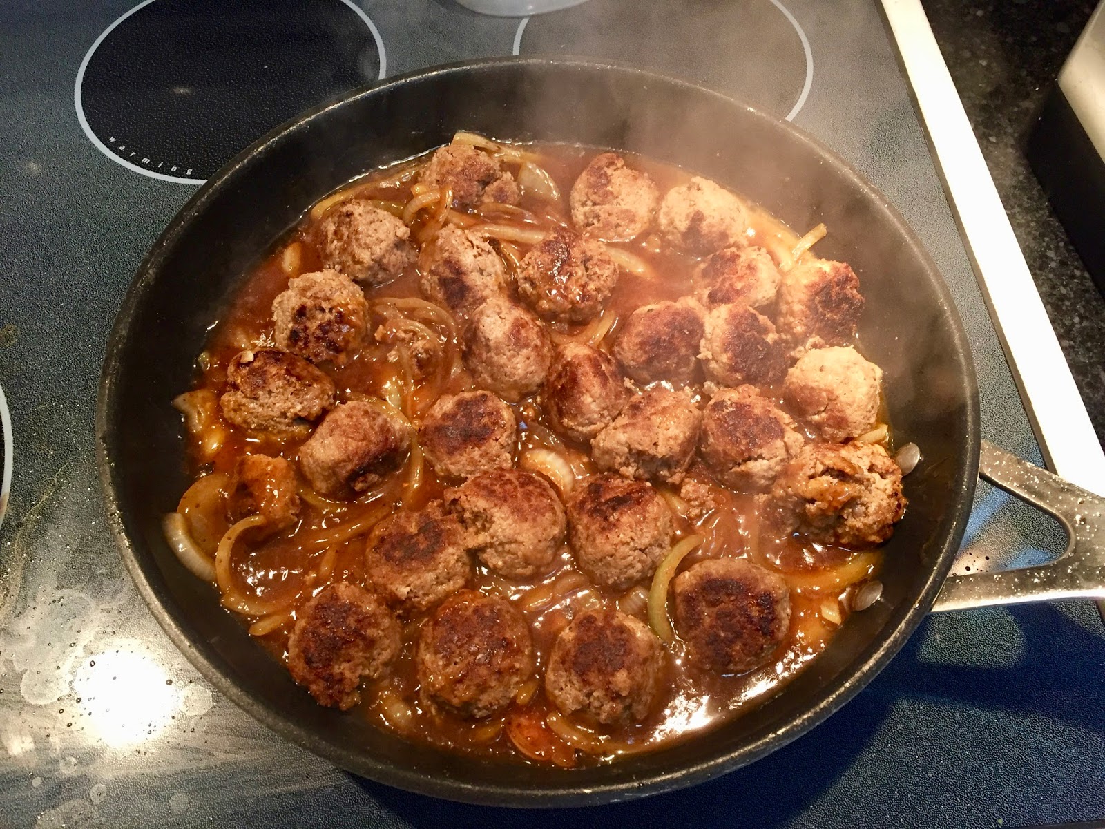 When the gravy is done add the meatballs back to the skillet and toss them around so they’re covered in the gravy.