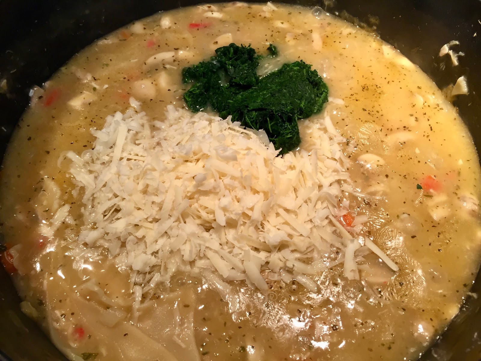 Turn heat to low, discard bay leaves and stir in cream, 1 cup Parmesan cheese and spinach. Warm through.