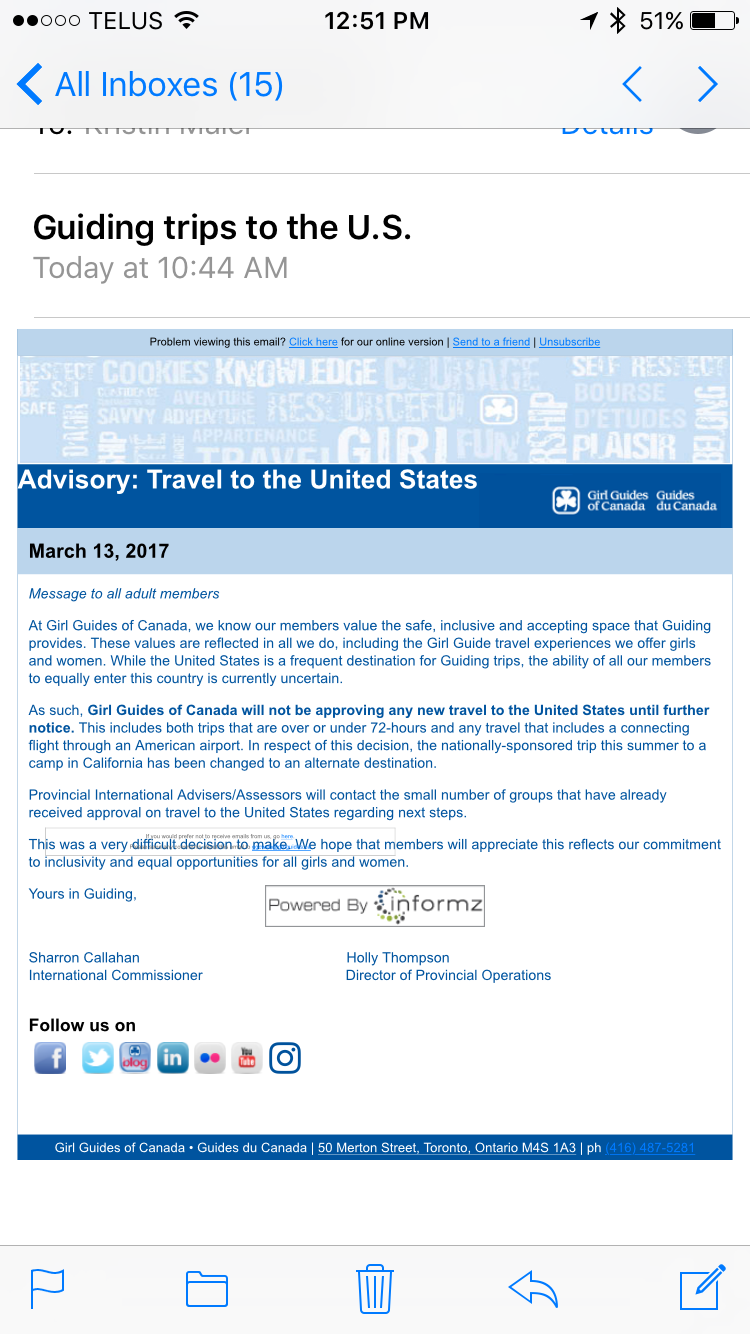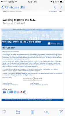 On that note… I received an email today from the Girl Guides of Canada. As I am a leader I get quite a few emails weekly. The email today was very interesting. It’s stated that the Girl Guides of Canada are committed to equality and equal opportunities for all the girls and women. Due to the travel ban in the United States all trips to and through the USA have been suspended until further notice.