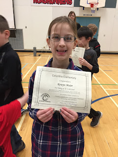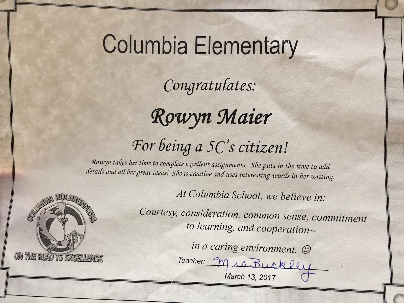 To cap off our week of “public displays”, this morning HBear got a big surprise! She was selected as 1 of the students that best represented 1 of the 5 C’s this month! She was awarded a certificate for her Commitment to Learning! She was very surprised and very excited!
