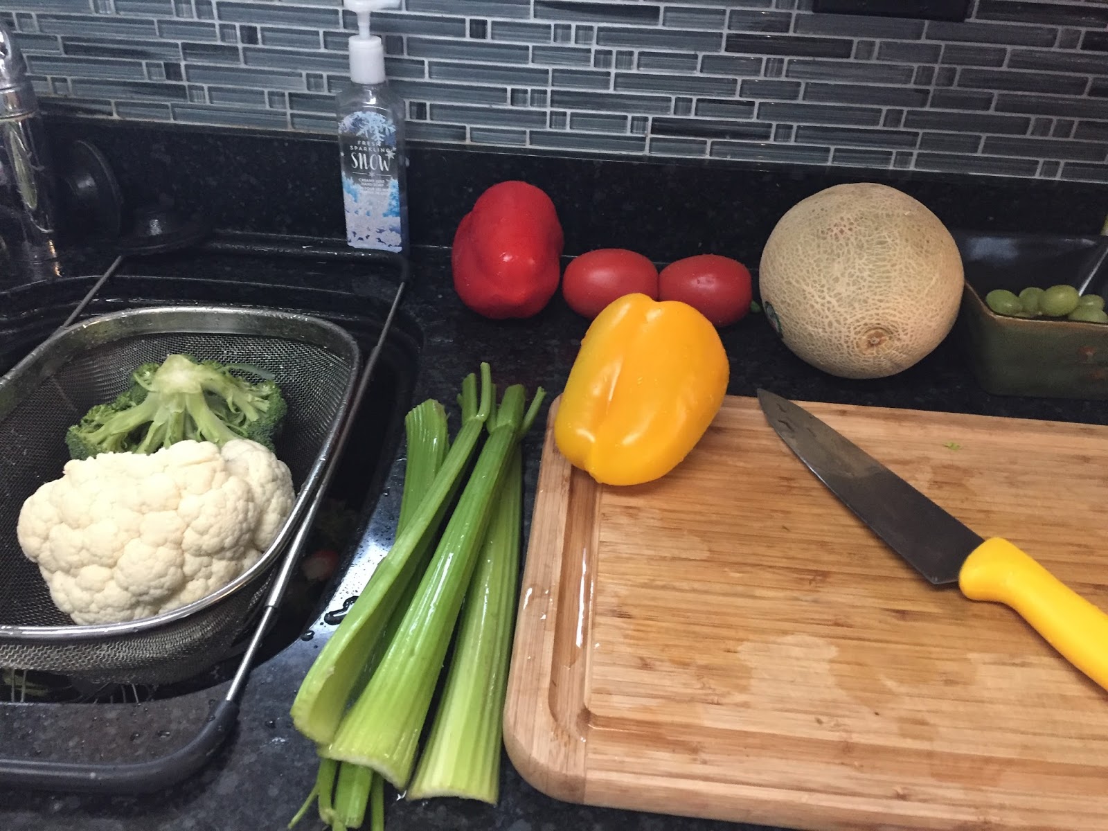 Ninja and the girls helped cut all the fruits and vegetables.