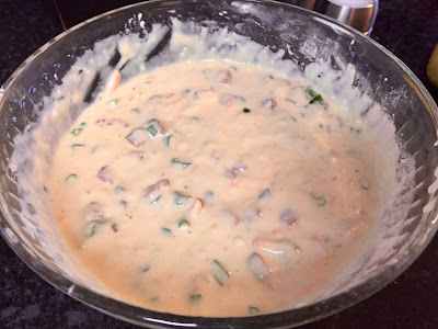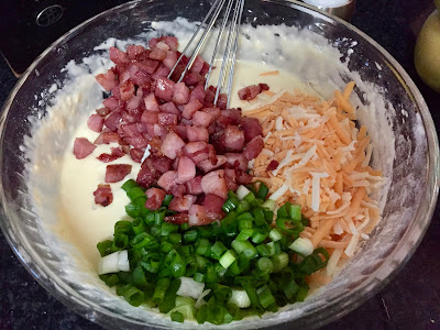 Then add pancetta, cheese and green onions and stir everything together.