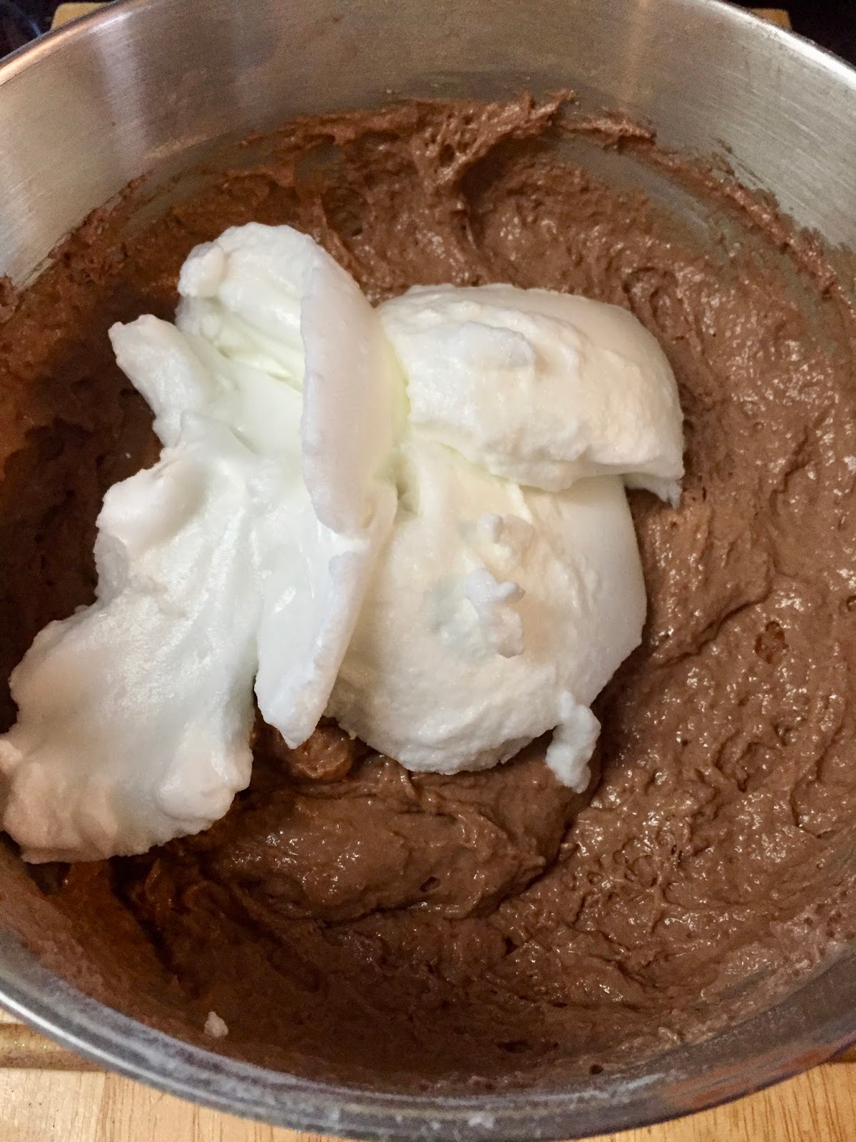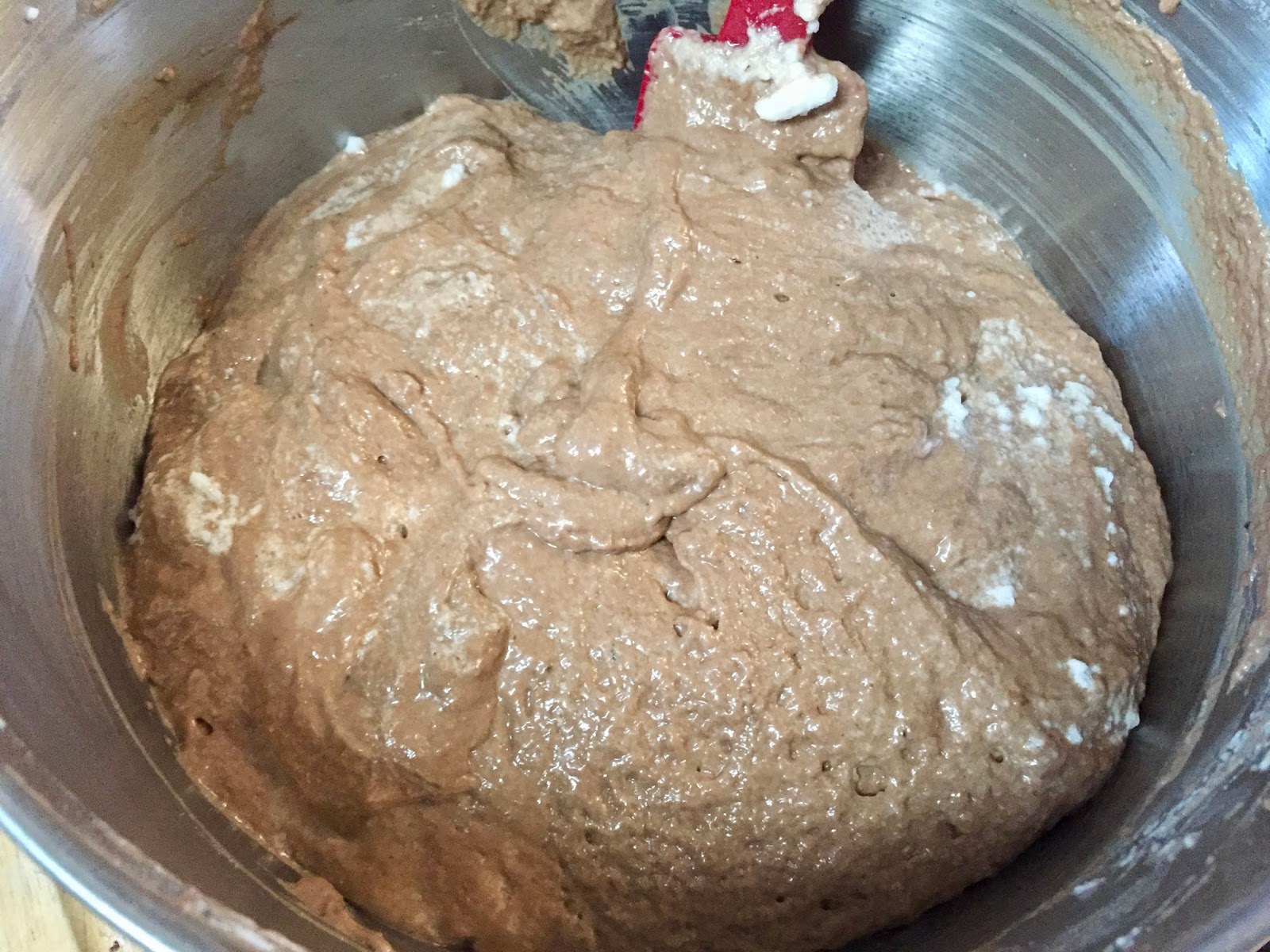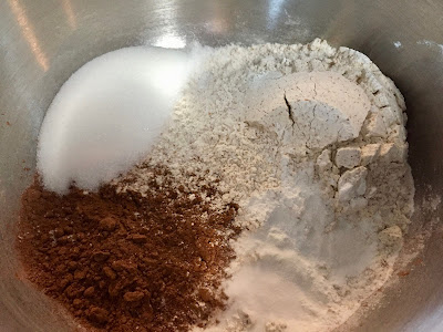In a large bowl, combine flours, cocoa powder, sugar, baking powder, baking soda and salt. Whisk together and set aside.