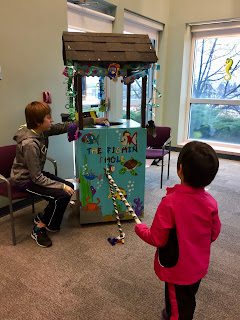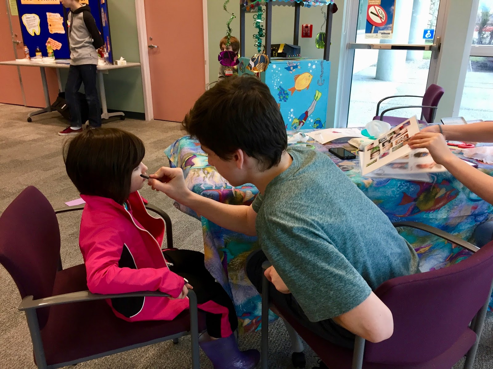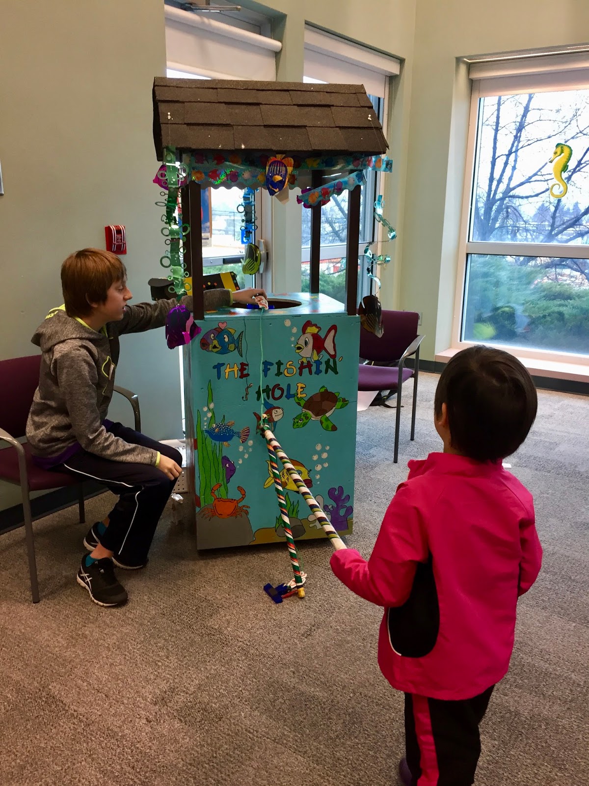 Next you take your gold coin into the waiting room and you fish for a prize and get your face painted. Then you can check out the different displays. They do this so people wait the mandatory 15 minutes to make sure there was no reaction.