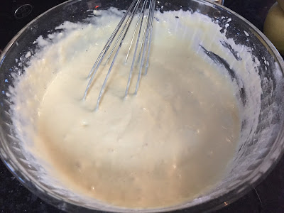 Add milk mixture to flour mixture and whisk together.