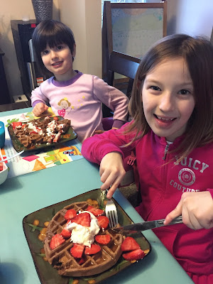 A while back I made waffles. I have been playing with my new waffle maker and experimenting. Ninja and Dad always feel like they are still hungry after a waffle dinner. I always feel like a big fluffy waffle with strawberries and whipped cream is more of a dessert then a dinner. So, I tried making savoury waffles with a garlic compound butter topped with a fried egg. They were super delicious! I knew the girls would have none of that LOL so I made them healthy chocolate waffles! These waffles are seriously like a chocolate cake! The girls loved them! Unfortunately I didn’t take very good pictures. Please don’t let my shoddy photography skills keep you from trying either of these two delicious recipes!
