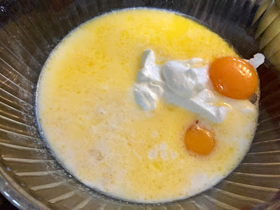 In a large glass measuring cup, combine melted butter, milk, Greek yogurt, egg yokes and apple cider vinegar.Whisk together and set aside.